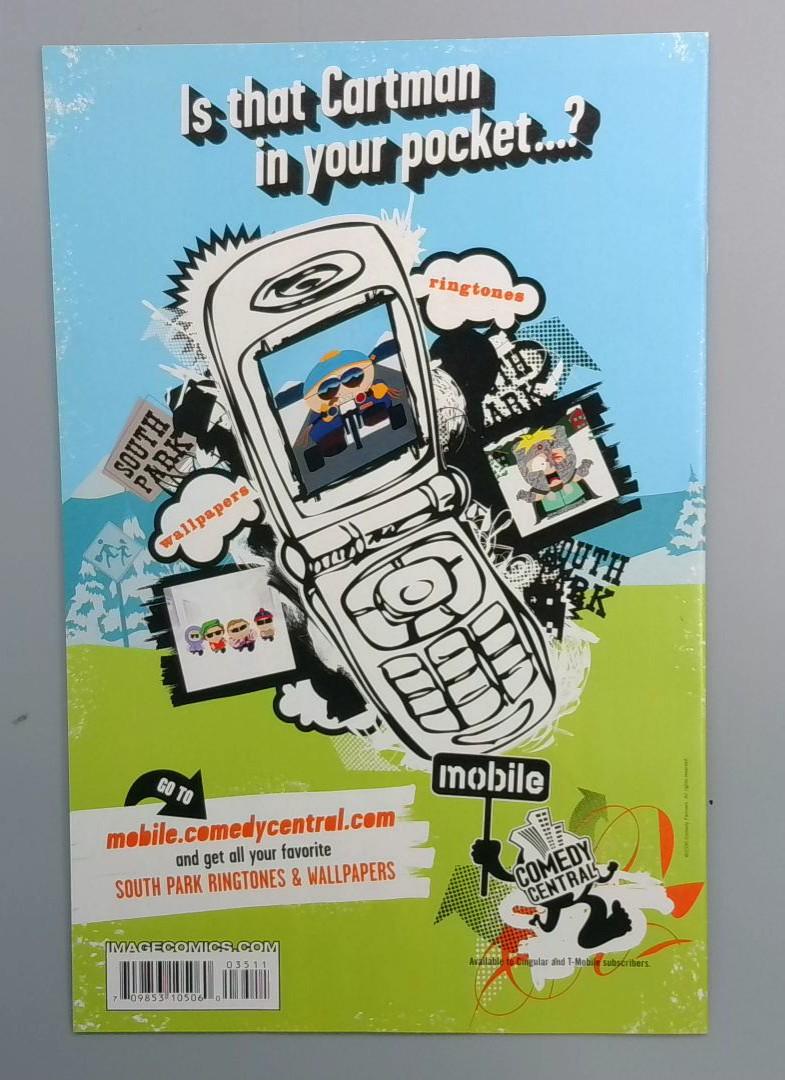 The back cover features a South Park promotional advertisement for mobile ringtones and wallpapers from Comedy Central, reflecting the early 2000s comic book market era.