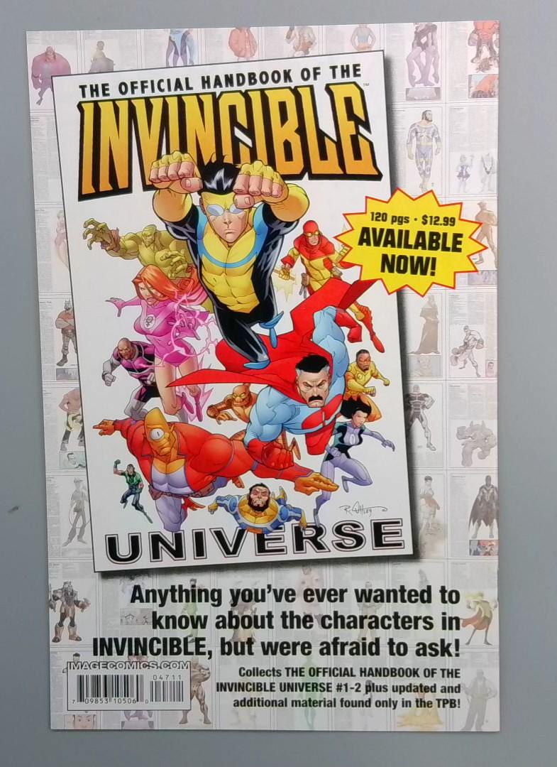Bonus Item Included: The Official Handbook of the Invincible Universe advertisement is also visible, promoting a 120-page handbook at $12.99 that collects character profiles and background information exclusive to that publication.