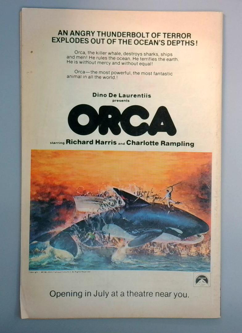 Also included is a vintage movie advertisement for Orca, the killer whale thriller starring Richard Harris and Charlotte Rampling, which was in theatrical release during this period and adds nostalgic context to the era of this publication.