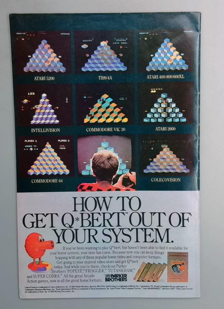A back cover advertisement promotes Q*bert across multiple gaming platforms including Atari 5200, Atari 400/800/600XL, Intellivision, Commodore VIC-20, Atari 2600, Commodore 64, and ColecoVision, highlighting the retro gaming context of this 1985 publication.
