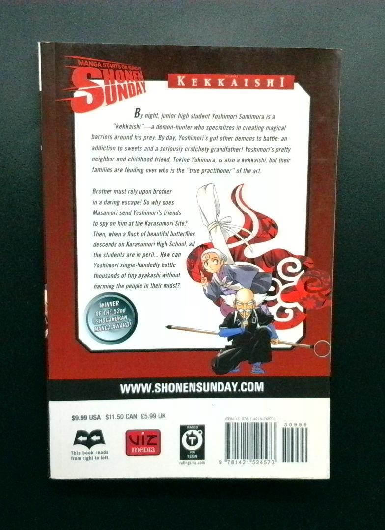 By night, junior high student Yoshimori Sumimura is a "kekkaishi"—a demon-hunter who specializes in creating magical barriers around his prey. By day, he battles his addiction to sweets and deals with his seriously crotchety grandfather. Yoshimori's pretty neighbor and childhood friend, Tokine Yukimura, is also a kekkaishi, but their families are feuding over who is the "true practitioner" of the art. In this volume, Yoshimori must rely on his brother in a daring escape, leading to mysterious circumstances at the Karasumori Site where beautiful butterflies descend upon the high school, putting all students in peril. Yoshimori must find a way to battle thousands of tiny ayakashi without harming the innocent people around him.