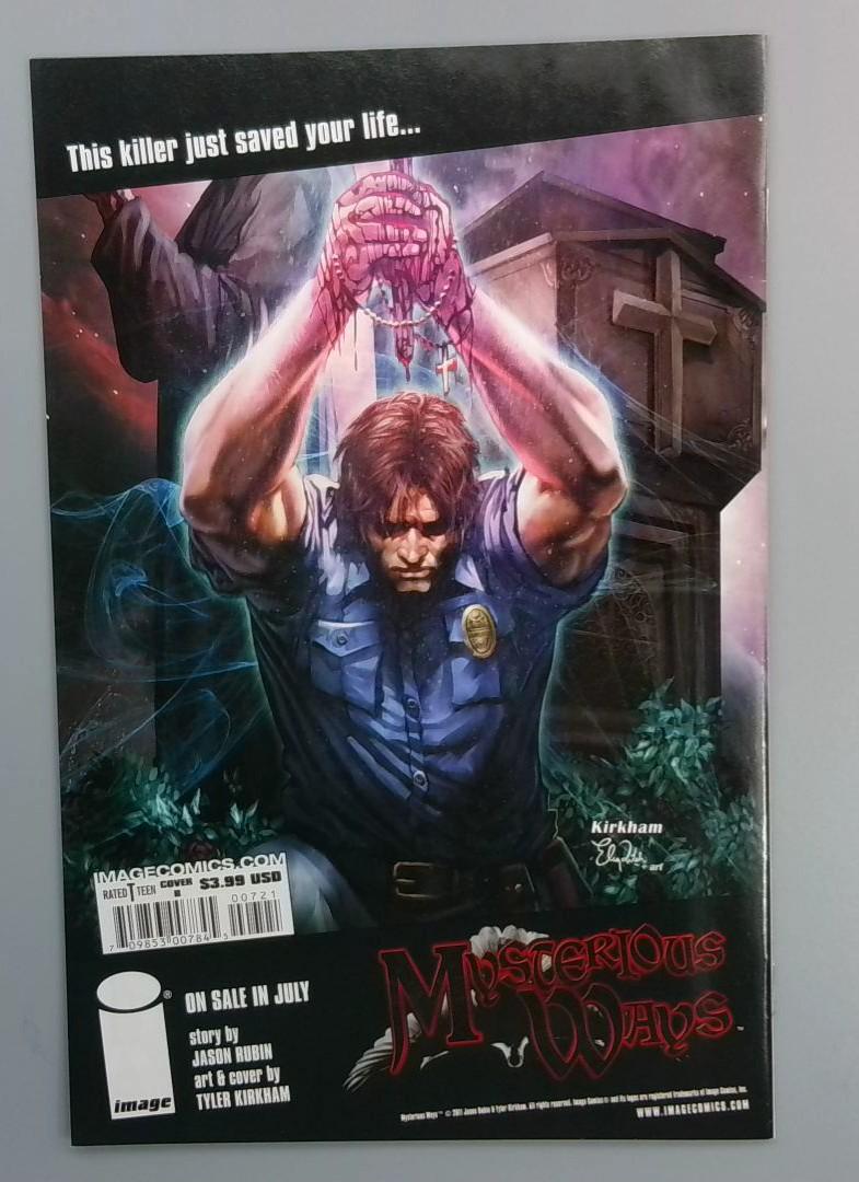 The Magdalena #7 is an Image Comics series by Ron Marz and Keu Cha, featuring a dynamic female protagonist in ornate armor wielding a mystical spear. The cover depicts a powerful warrior with flowing red hair and a billowing red cape, standing in a dramatic pose against a golden background. This issue appears to be part of a supernatural action series centered around a mystical warrior figure. Mysterious Ways #1 is an Image Comics title by Jason Rubin and Tyler Kirkham, featuring a police officer in a dark, supernatural scenario. The cover suggests a thriller involving paranormal elements, with the protagonist seemingly experiencing a bizarre mental or spiritual event, surrounded by a cemetery and mysterious energy. The tagline "This killer just saved your life..." hints at a complex narrative involving potential supernatural intervention.