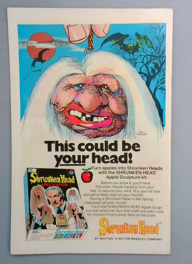 The back cover features a full-page advertisement for the Shrunken Head Apple Sculpture Kit by Whitling, a Milton Bradley Company toy that allows children to turn apples into tiny shrunken heads. The ad copy promises Halloween fun year-round and shows the creepy product packaging alongside an example of the finished craft.