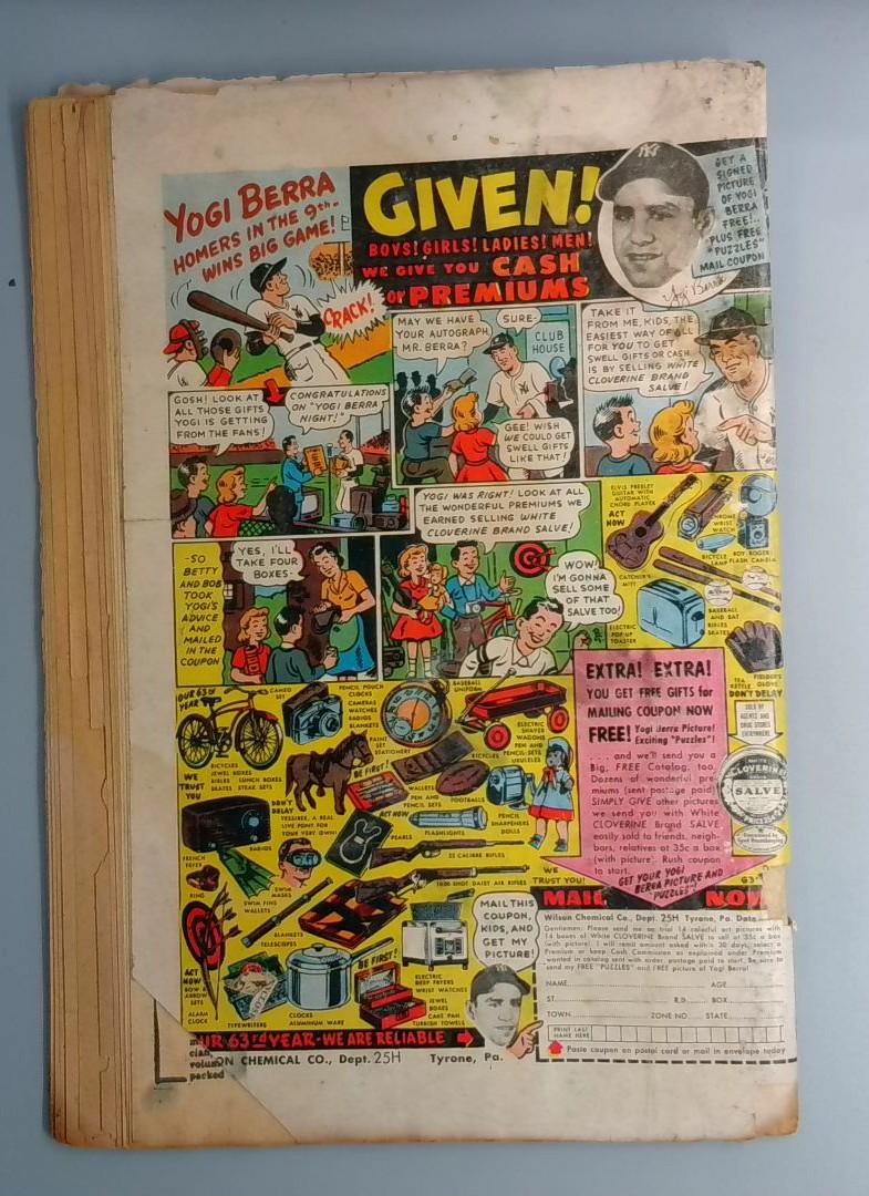 This comic includes a full inside back cover advertisement for Yogi Berra's premium giveaway promotion, featuring the baseball legend and various merchandise offers including the famous White Cloverine Brand Salve products typical of mid-century comic book marketing.