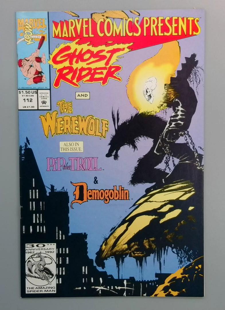 Marvel Comics Presents #112 features a striking silhouette cover of a female character, likely focusing on Typhoid Mary. The issue is part of the Marvel Comics Presents anthology series, which typically showcased multiple characters and storylines in a single issue. This particular cover stands out for its bold yellow background and dramatic black silhouette design, highlighting the character's dynamic pose. Marvel Comics Presents #112 also includes a Ghost Rider cover featuring the supernatural anti-hero alongside other characters like Werewolf, Pip the Troll, and Demogoblin. The issue is part of Marvel's 30th anniversary celebration, commemorating the period from 1962 to 1992. The cover art showcases Ghost Rider in a dramatic, chain-wielding pose against a moody cityscape background.