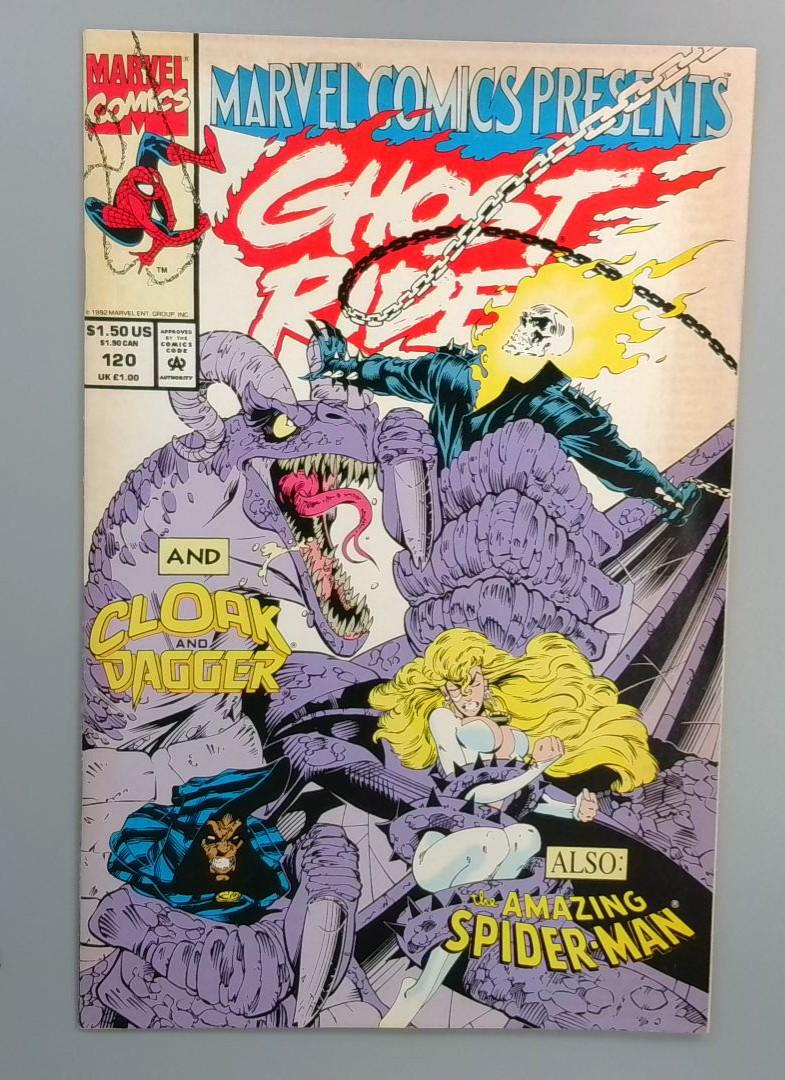 Anthology issue Marvel Comics Presents #120 (1992) featuring a main Wolverine vs. Venom story with a Constrictor backup. Also contains separate Ghost Rider and Cloak & Dagger tales and bears the Amazing Spider-Man 30th anniversary logo on the cover. A multi-feature issue of short, action-driven stories spotlighting several Marvel characters.
