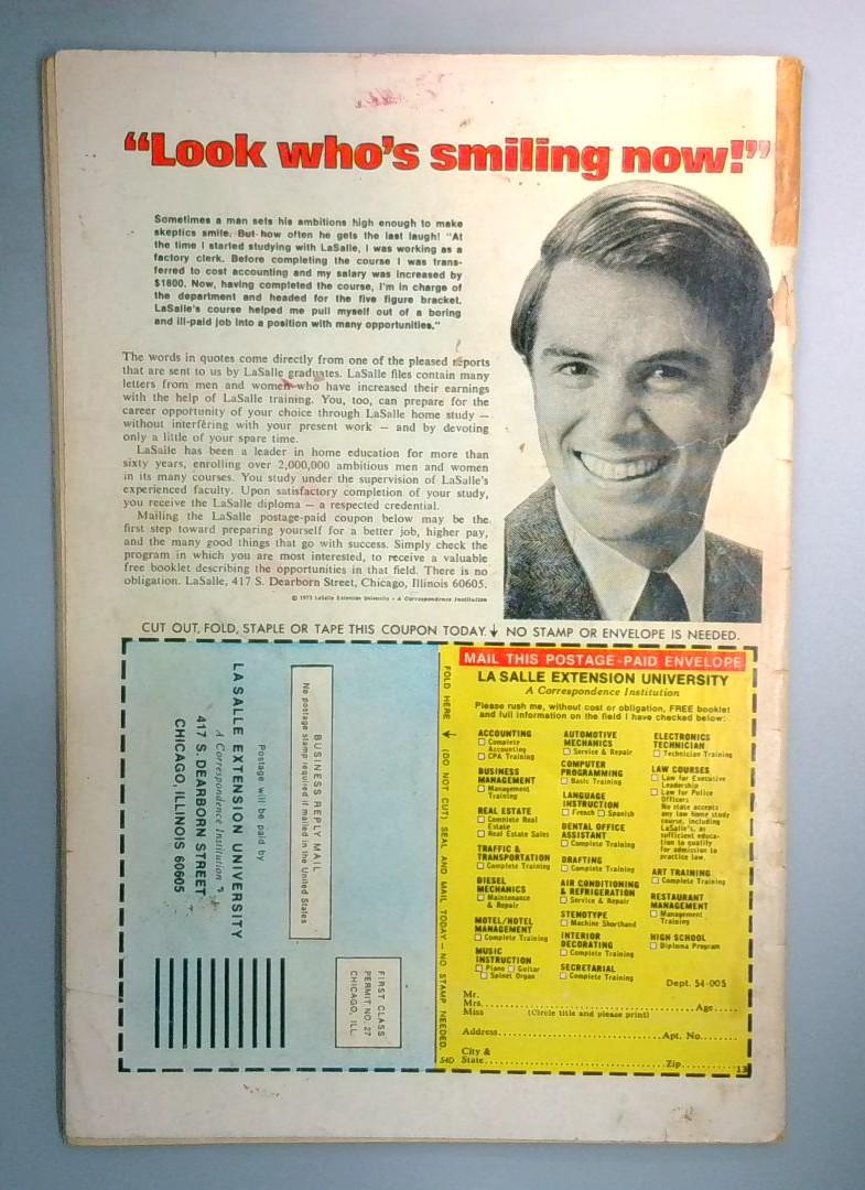 This issue features Captain America and Iron Man in a thrilling adventure against The Red Skull, who strikes again with nefarious plans. The cover showcases an intense battle scene with Captain America's shield raised defensively against a monstrous adversary. The comic also includes an educational advertisement for LaSalle Extension University's correspondence courses, a common feature in Marvel comics of this era.