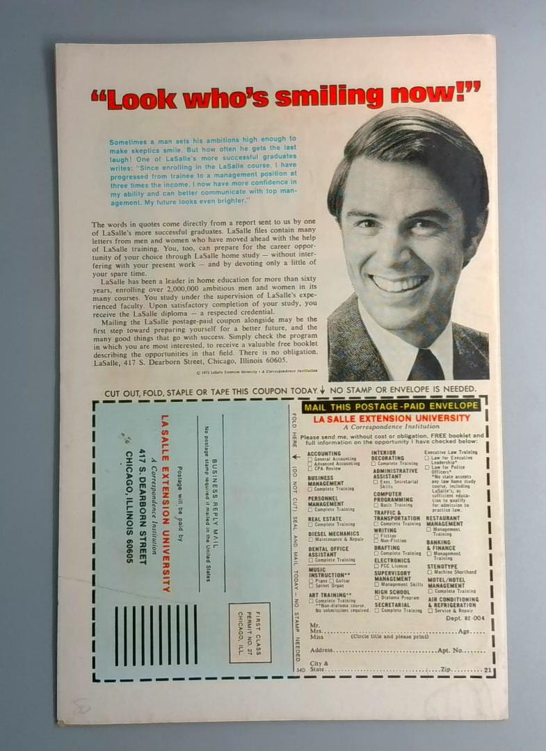 The issue is priced at 30 cents, indicating its vintage Bronze Age origins, and includes an interior advertisement page featuring a LaSalle Extension University mail-in coupon, typical of educational ads found in Marvel comics of this era.