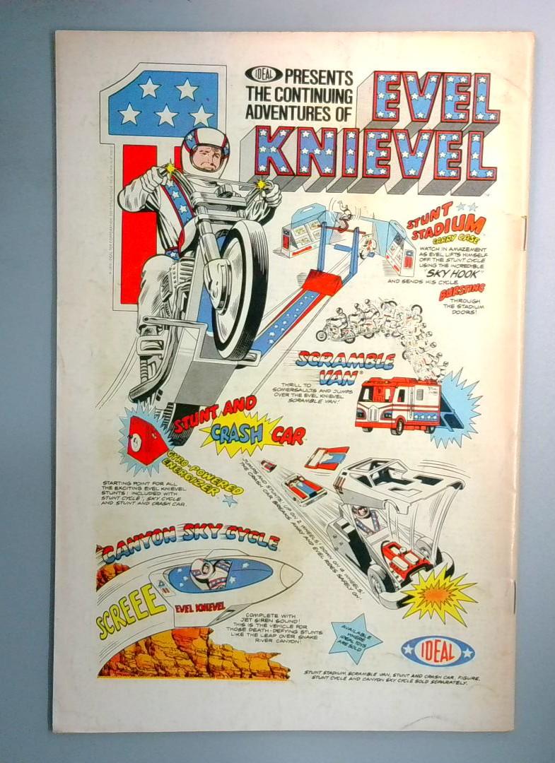 The back cover features an Ideal toy advertisement for Evel Knievel action figures and vehicles, including the iconic Stunt Stadium, Scramble Van, Crash Car, and Cannon Sky-Cycle—a snapshot of 1970s toy culture that adds historical value to this vintage comic.