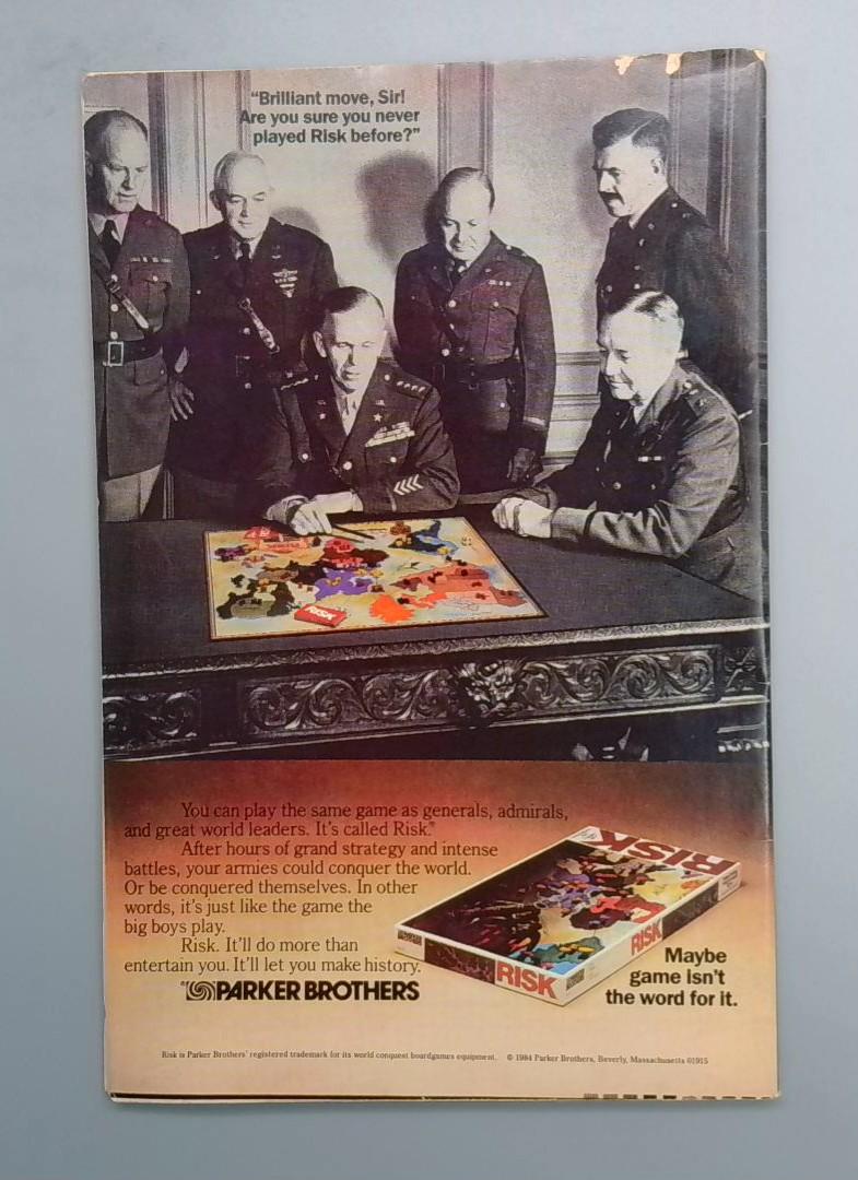 The back cover features a vintage Parker Brothers advertisement for the board game Risk, creating an interesting thematic parallel between the strategic warfare depicted in the comic and the real-world strategy game.
