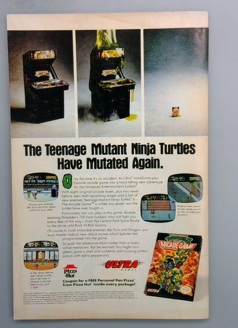 The back cover includes a promotional advertisement for the Teenage Mutant Ninja Turtles arcade game adaptation for the Nintendo Entertainment System, featuring Pizza Hut cross-promotion offering coupons for free personal pan pizzas.