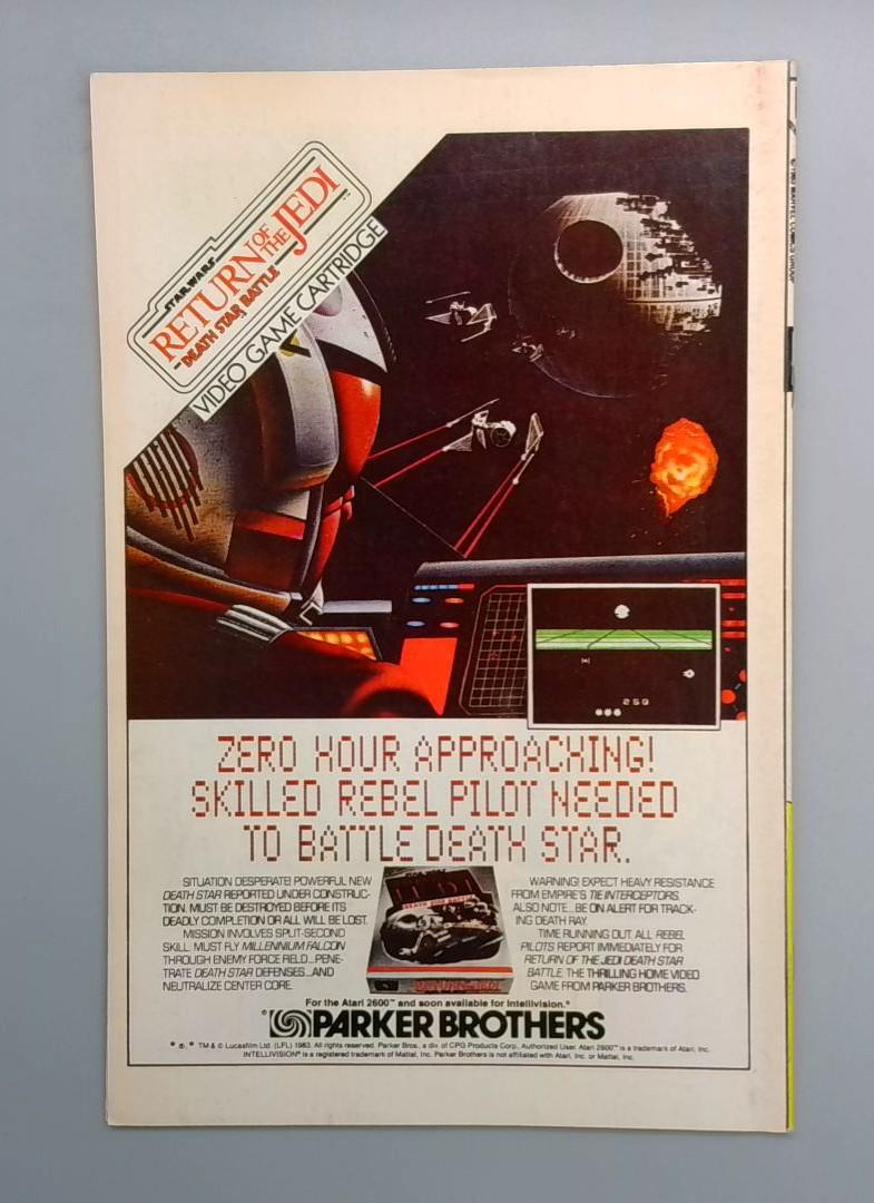 Also included in this issue is an advertisement for the Atari 2600 video game Return of the Jedi by Parker Brothers, showing the iconic Death Star gameplay and promoting the home video game adaptation of the Star Wars saga.