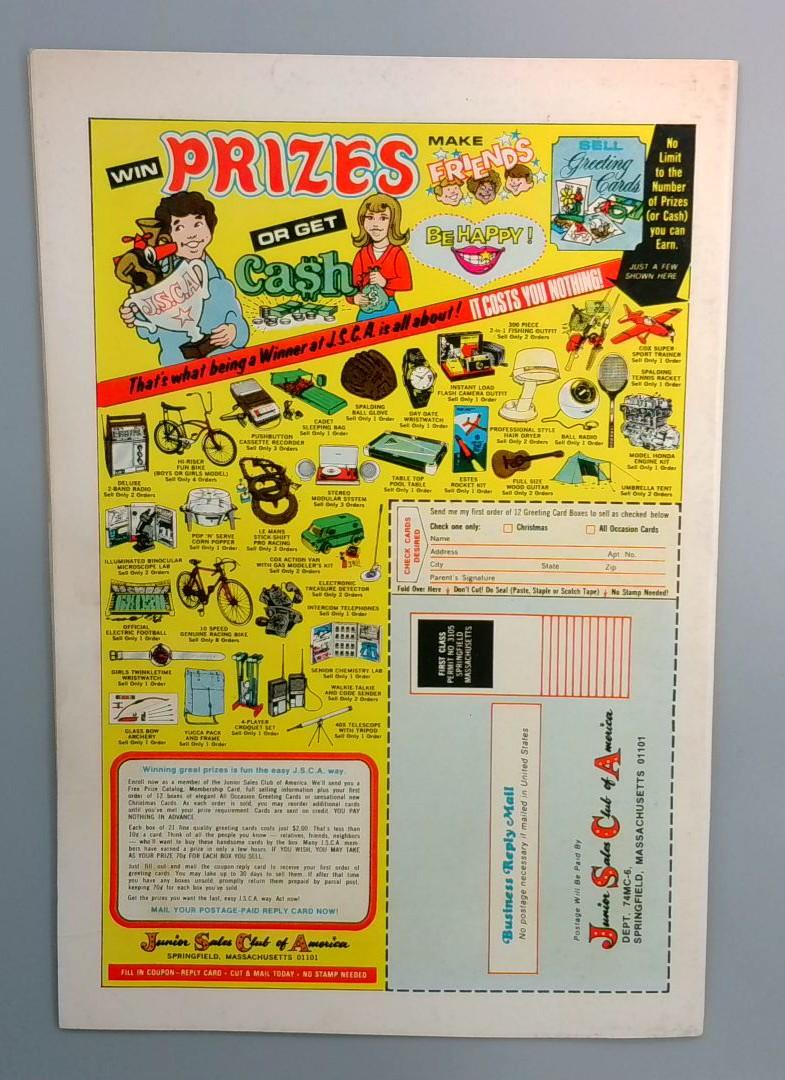 This action-packed issue brings together two of Marvel's most dynamic teams as The Thing joins forces with the Guardians of the Galaxy in an exciting cosmic adventure. The cover proclaims "It's Clobberin' Time!" as the orange-skinned powerhouse battles alongside Star-Lord, Rocket Raccoon, Groot, and Gamora against formidable foes. The back cover features a vintage Marvel house ad promoting prize giveaways and a Junior Scouts Club of America membership opportunity, adding to the nostalgic appeal of this 25-cent Bronze Age gem. This issue represents a key moment in Marvel's exploration of intergalactic storytelling during the early 1970s.