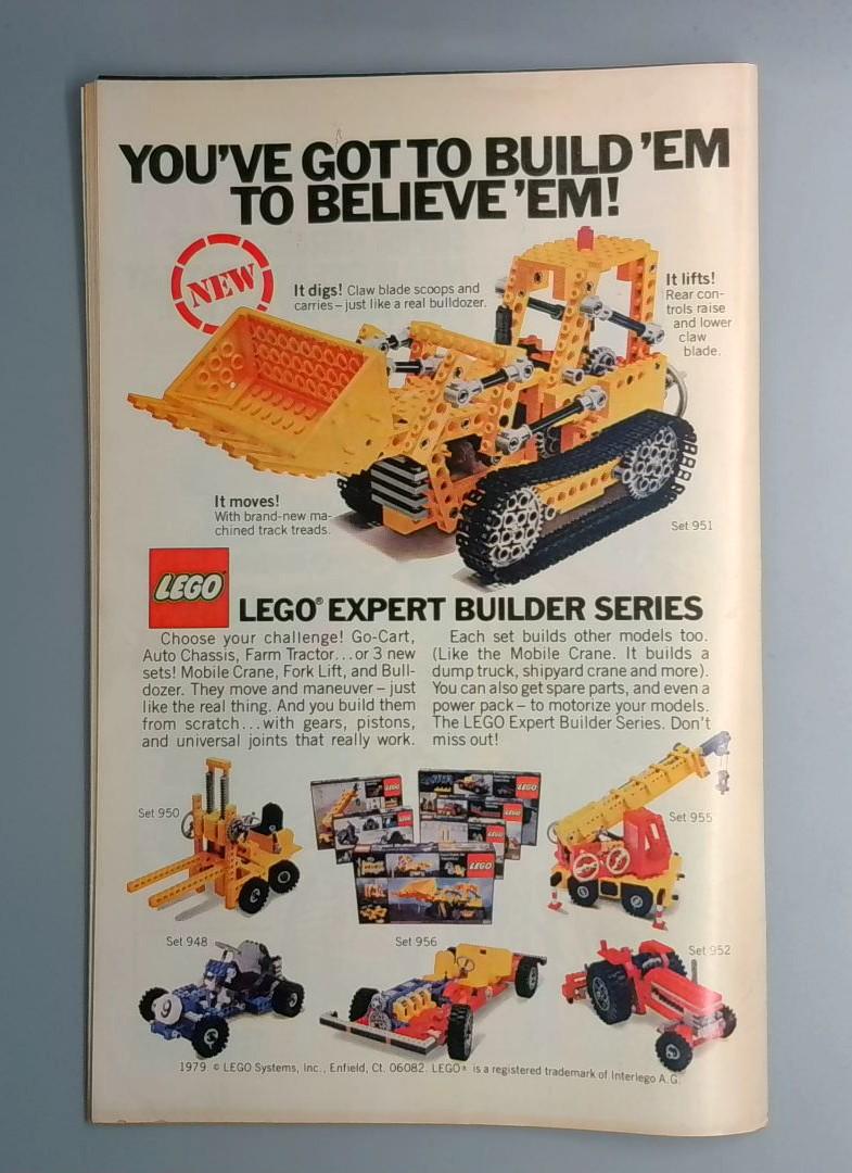 This issue presents "Towering Infernos!" as the Thing and Human Torch face off against overwhelming odds in an action-packed story. The cover showcases vibrant artwork with the two heroes battling amid explosive chaos and towering flames, capturing the classic Marvel style of the era. A vintage advertisement for the LEGO Expert Builder Series appears on the back cover, adding nostalgic appeal for collectors of this 40-cent Bronze Age comic.