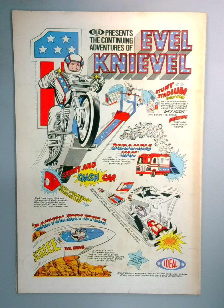 Bonus Content: Back matter includes an Ideal advertisement presenting "The Continuing Adventures of Evel Knievel" with colorful illustrations of stunt vehicles and action toys including the Stunt Stadium, Scramble Van, Crash Car, and Canyon Sky Cycle.