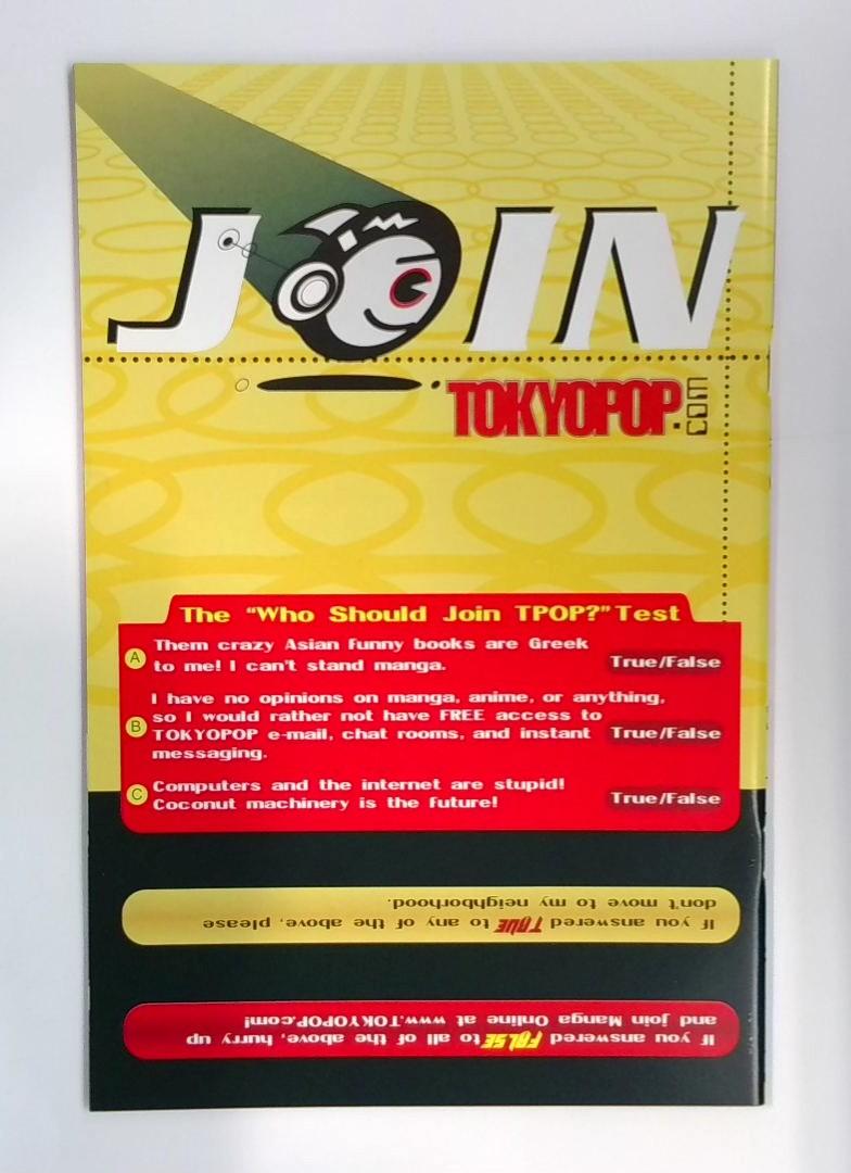 The back cover includes the "Who Should Join TFOP?" personality test, a fun interactive feature that invites readers to discover which character archetype they align with based on their attitudes toward manga, anime, and internet culture—a charming touch typical of early 2000s manga publishing.