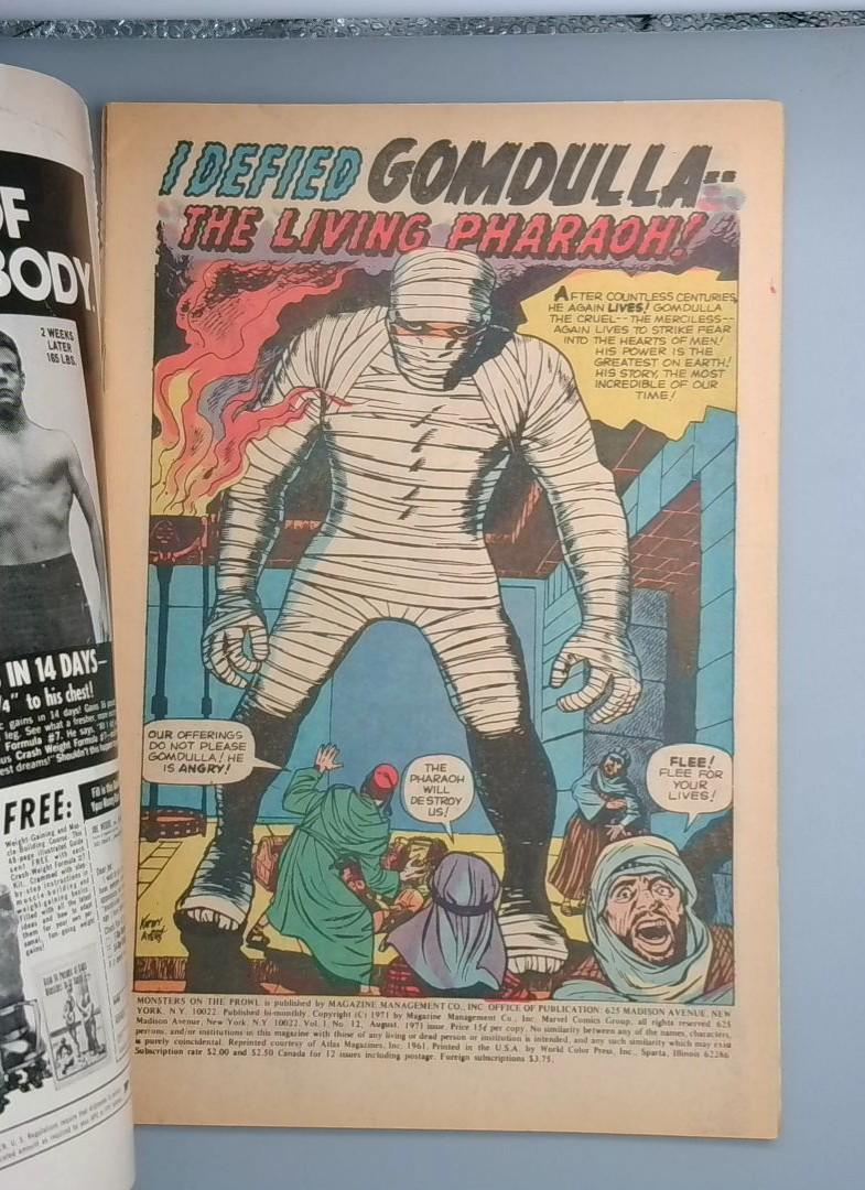 "Monsters on the Prowl" #12 features the terrifying debut of Gomdulla, the Living Pharaoh - an ancient Egyptian monster awakened after centuries of slumber. The massive mummy-like creature towers over frightened humans, threatening destruction with his immense size and supernatural power. This Marvel comic explores the classic monster theme of an ancient, vengeful being unleashed upon the modern world, with dramatic artwork depicting Gomdulla's menacing presence in an Egyptian-themed setting.