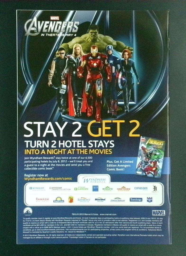 This copy was also used as a promotional variant for the Avengers film tie-in campaign, featuring a back cover advertisement for the "Stay 2 Get 2" Wyndham Rewards promotion tied to Marvel's Avengers theatrical release in May 2012, making this a notable crossover collectible from that era.
