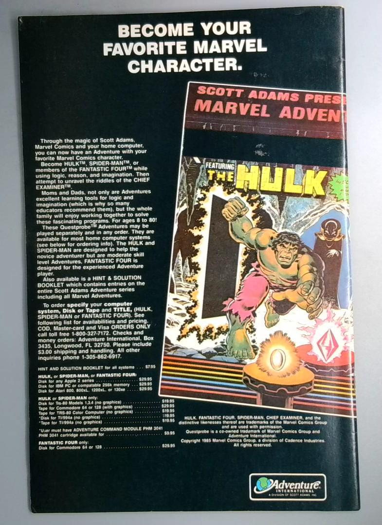 The back cover includes an advertisement for Scott Adams Marvel Adventures computer games, allowing readers to interact with their favorite Marvel characters including The Hulk, Spider-Man, and Fantastic Four on home computer systems across various platforms and formats available in 1986.