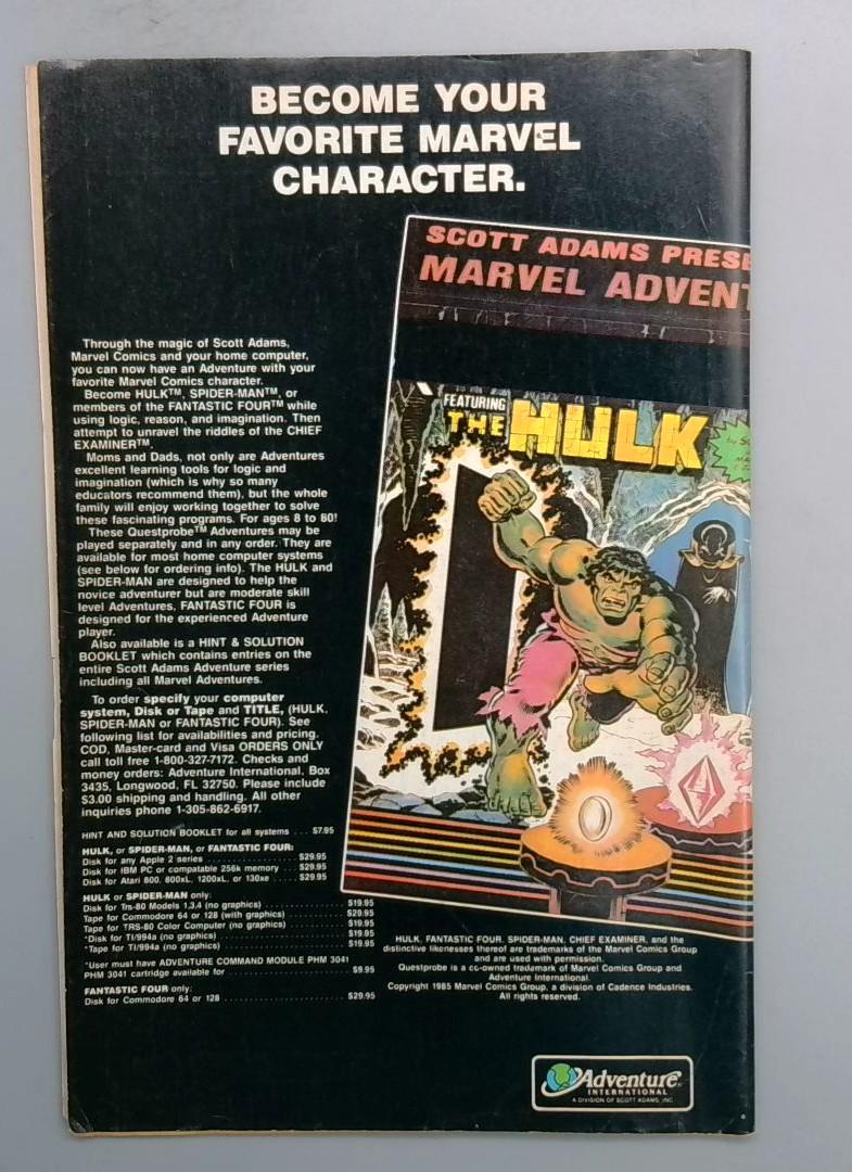 The back cover features advertising for Scott Adams' Marvel Adventure interactive computer games, highlighting titles including The Hulk, Spider-Man, Fantastic Four, and Chief Examiner, demonstrating the cross-media Marvel presence of the era. This was a time when Marvel was expanding into home computer entertainment.