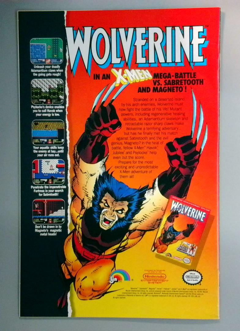 Back Cover: Features a Nintendo video game advertisement for Wolverine in an X-Men Mega-Battle vs. Sabretooth and Magneto, highlighting a classic 8-bit adventure game where players control Wolverine through various challenges including his mutant regenerative healing abilities and adamantium claws against formidable enemies.