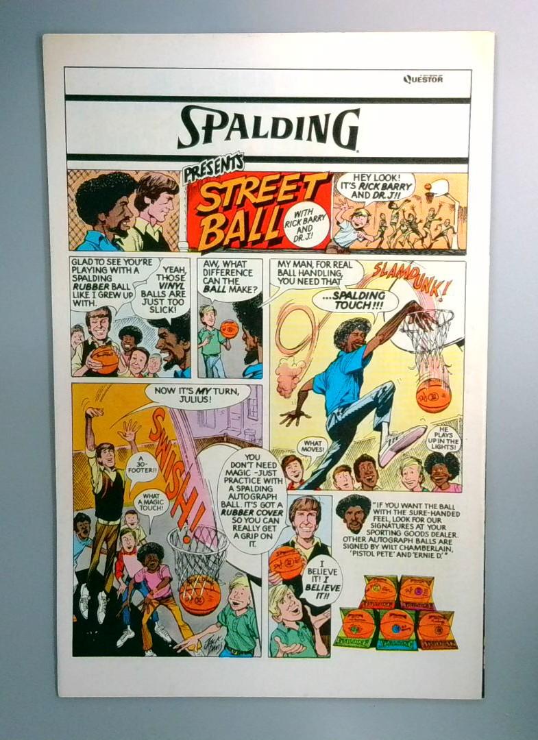 The back matter includes a Spalding basketball promotional comic featuring Rick Barry and Dr. J, highlighting the cross-promotional marketing common to comics of this era.