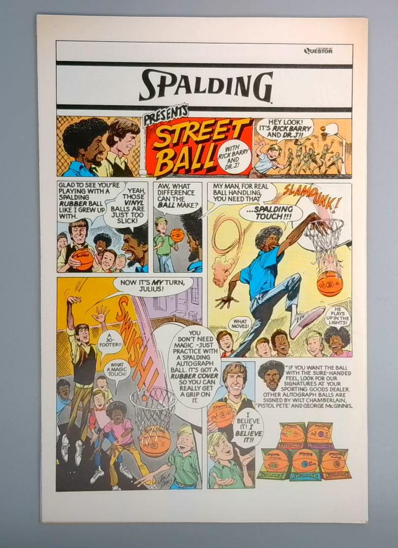 The issue also includes a backup feature: Spalding Presents Street Ball with Rick Barry and Dr. J! This advertisement/comic hybrid showcases basketball legends Rick Barry and Julius Erving in an entertaining promotional piece for Spalding sporting goods, highlighting their autographed rubber basketballs and the "Spalding Touch."
