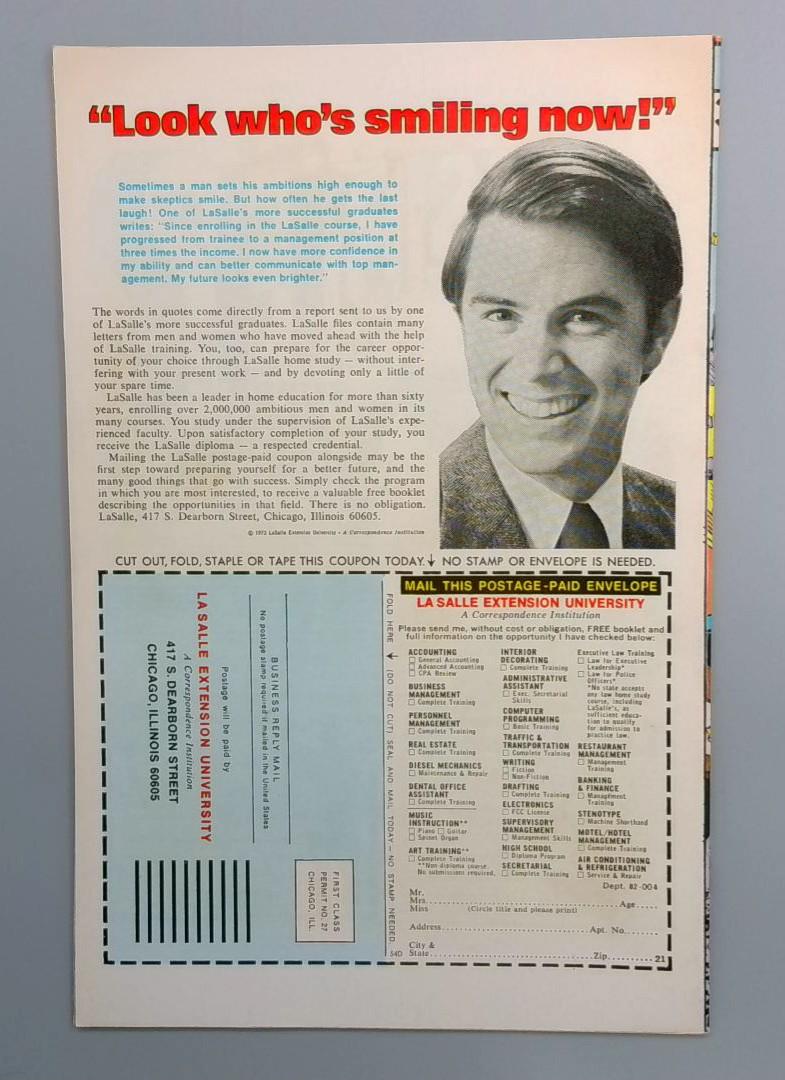 The back cover includes a LaSalle Extension University advertisement, a common educational insert found in Marvel comics of this era, featuring a testimonial section titled "Look who's smiling now!" with a vintage postage-paid coupon for their correspondence courses.