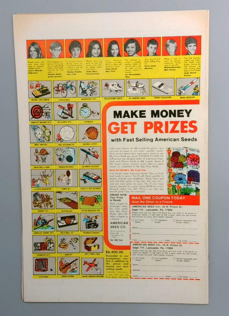 The back cover includes a classic American Seeds mail-order prize promotion, typical of comics from this era, offering readers the chance to make money and win prizes through seed sales.