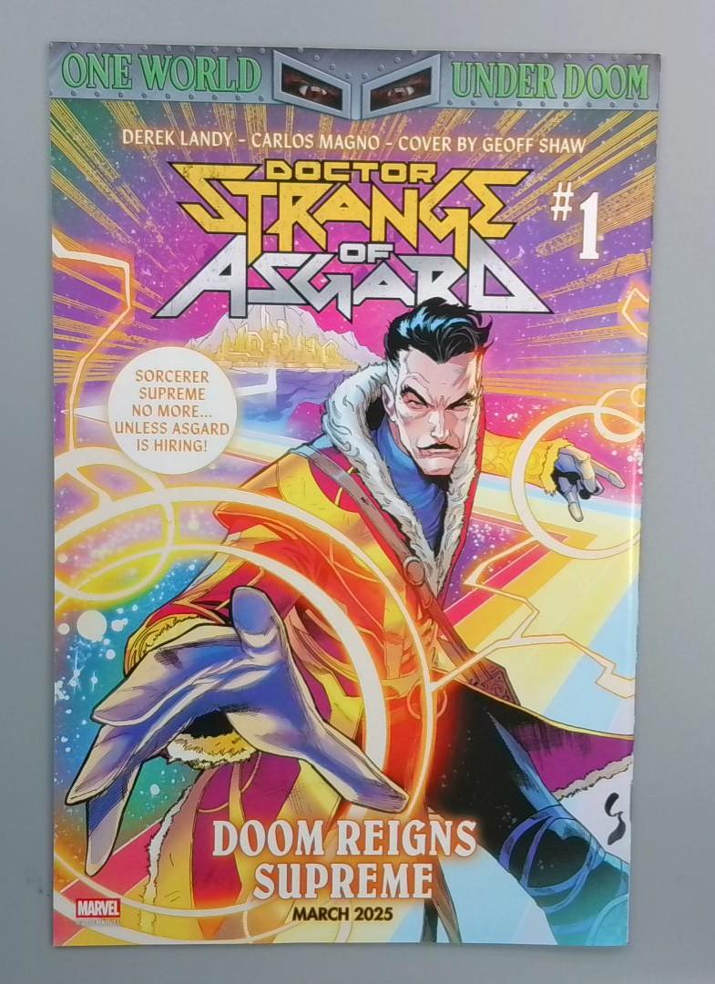 Doctor Strange of Asgard #1 — a One World Under Doom tie-in — pitches Strange into a reality-bending crossover where Sorcerer Supreme is displaced and Victor Von Doom asserts dominion. Written by Derek Landy with art by Carlos Magno, this is the March 2025 first issue. Variant cover by Geoff Shaw prominently features Doctor Doom towering over humbled heroes under the "One World Under Doom" banner.