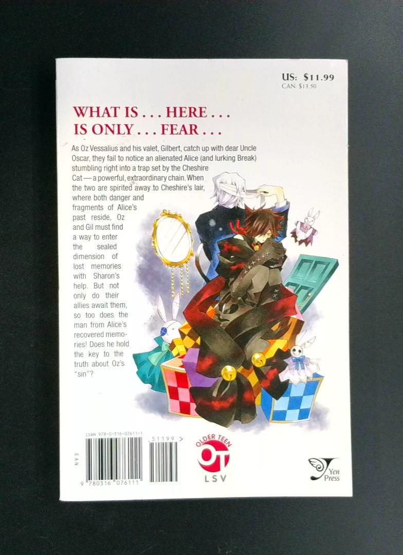 As Oz Vessalius and his valet Gilbert catch up with their dear Uncle Oscar, they fail to notice an alienated Alice and the lurking Break stumbling into a trap set by the Cheshire Cat—a powerful, extraordinary chain. When the two are spirited away to Cheshire's lair, where both danger and fragments of Alice's past reside, Oz and Gil must find a way to enter the sealed dimension of lost memories with Sharon's help. But not only do their allies await them, so too does the man from Alice's recovered memories. Does he hold the key to the truth about Oz's "sin"?
