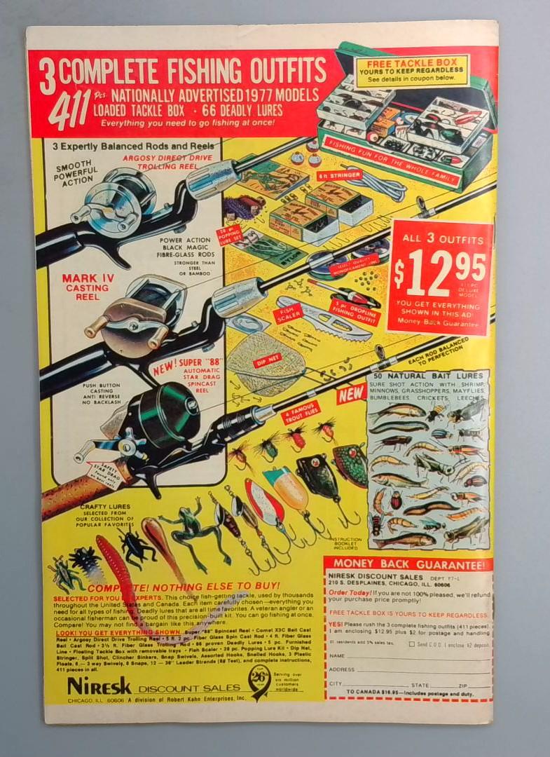 This 30-cent issue includes vintage advertisements, including a full-page ad for fishing outfits, reflecting the era's advertising practices in comic books.