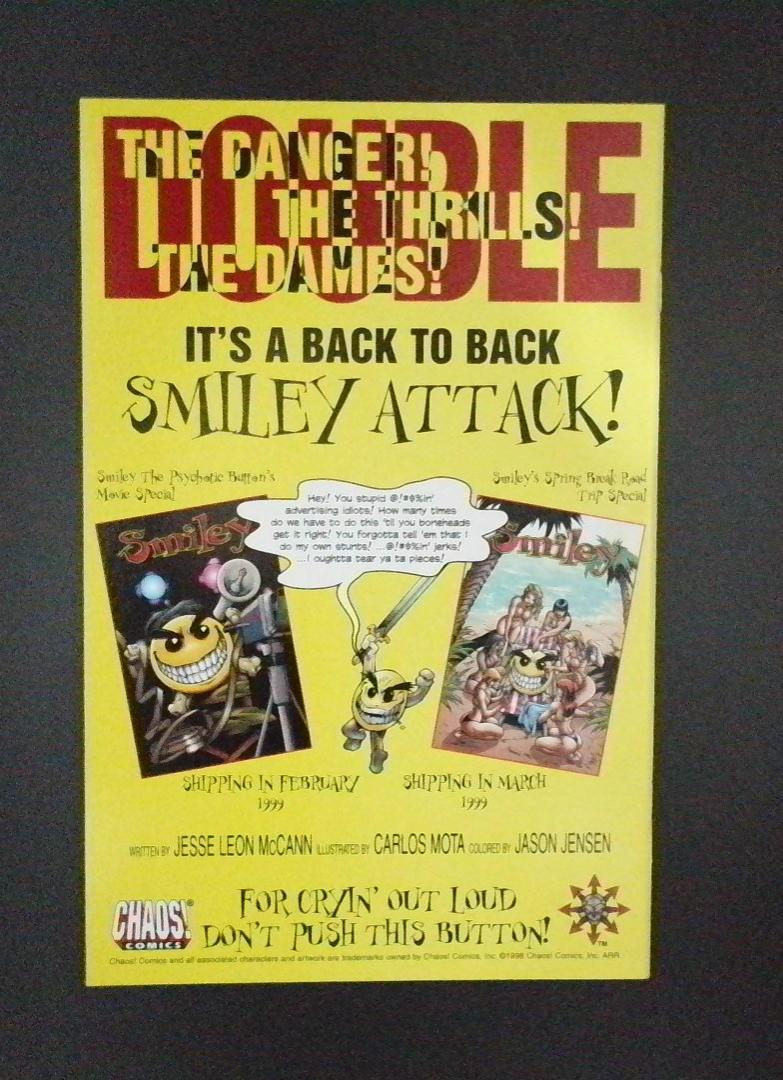 This issue also includes an insert advertisement for a back-to-back "Smiley Attack" featuring two upcoming Smiley mini-series: Smiley: The Psychotic Buffoon's New World (shipping February 1999) and Smiley's Spring Break Bash (shipping March 1999), written by Jesse Leon McCann and illustrated by Carlos Mota.