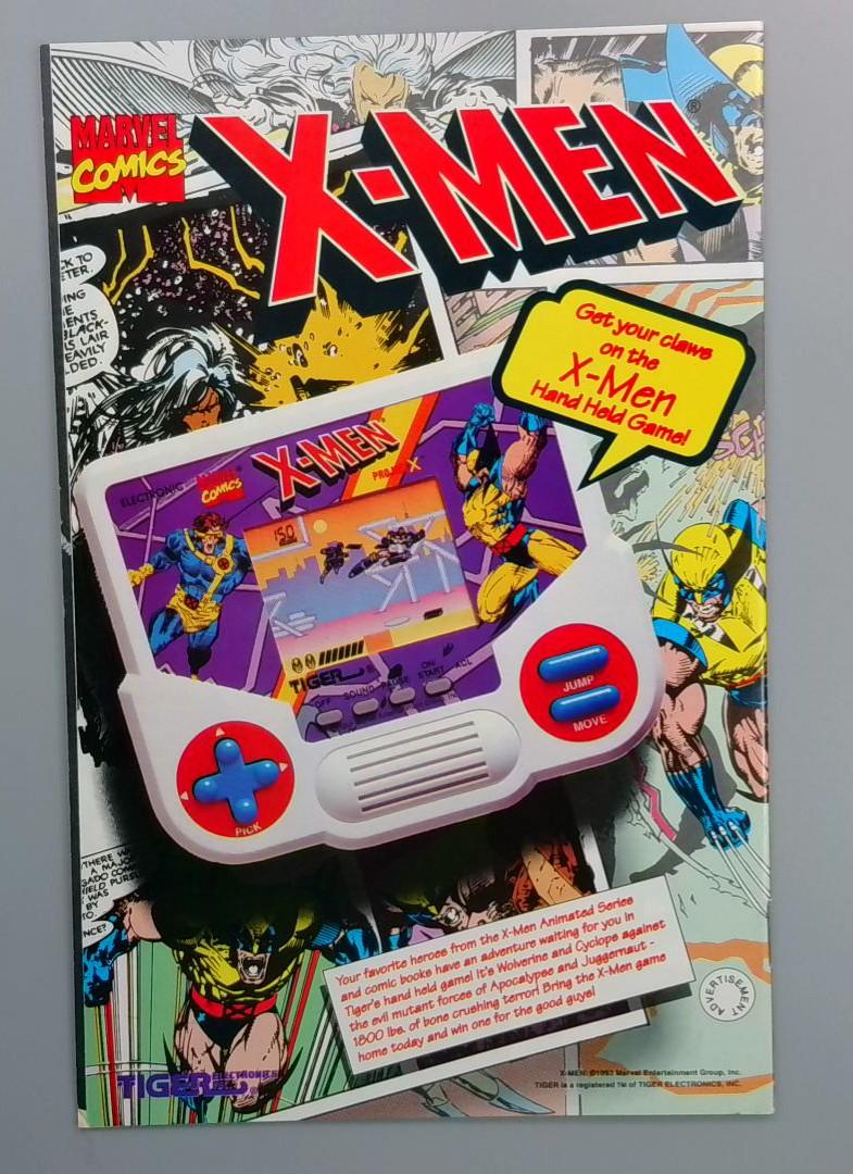 The Ren & Stimpy Show #12 features a hilarious "I Scream Clones!" cover, depicting multiple identical versions of the characters packed tightly across the image. The comic book, published by Marvel Comics in November, showcases the zany and absurd humor typical of the animated series. A central character with a different expression stands out among the sea of repeated characters, highlighting the issue's comedic premise. The cover's vibrant colors and stylized art capture the show's distinctive visual style. The X-Men comic showcases a promotional image featuring a handheld electronic game, highlighting the popular animated series and its merchandising. The cover displays multiple X-Men characters in dynamic poses, with a focus on promoting the Tiger game featuring the mutant heroes. The design emphasizes the action and excitement of the X-Men franchise, targeting fans of the animated series and comic book characters.