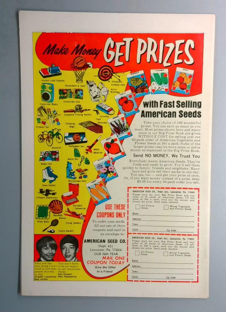 This issue also includes an advertisement for American Seeds prize promotion, a vintage mail-order scheme offering prizes and money-making opportunities through seed sales—a nostalgic artifact of 1970s comic book marketing.