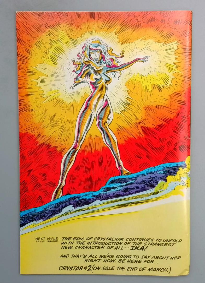 This debut issue introduces Crystar, the Crystal Warrior, in an epic tale of magic, conflict, and otherworldly adventure. The dramatic cover art showcases the hero amid fiery battles and a crystalline fortress, promising the start of an ambitious fantasy saga. The back cover teases the introduction of a mysterious new character named Ska and hints at the expanding mythology of Crystallium in the upcoming second issue.