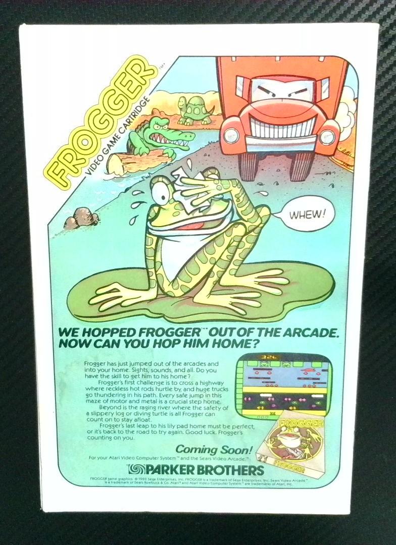 Also included is a vintage Frogger video game advertisement from Parker Brothers, promoting the upcoming Atari port of the classic arcade game with gameplay instructions and visuals.