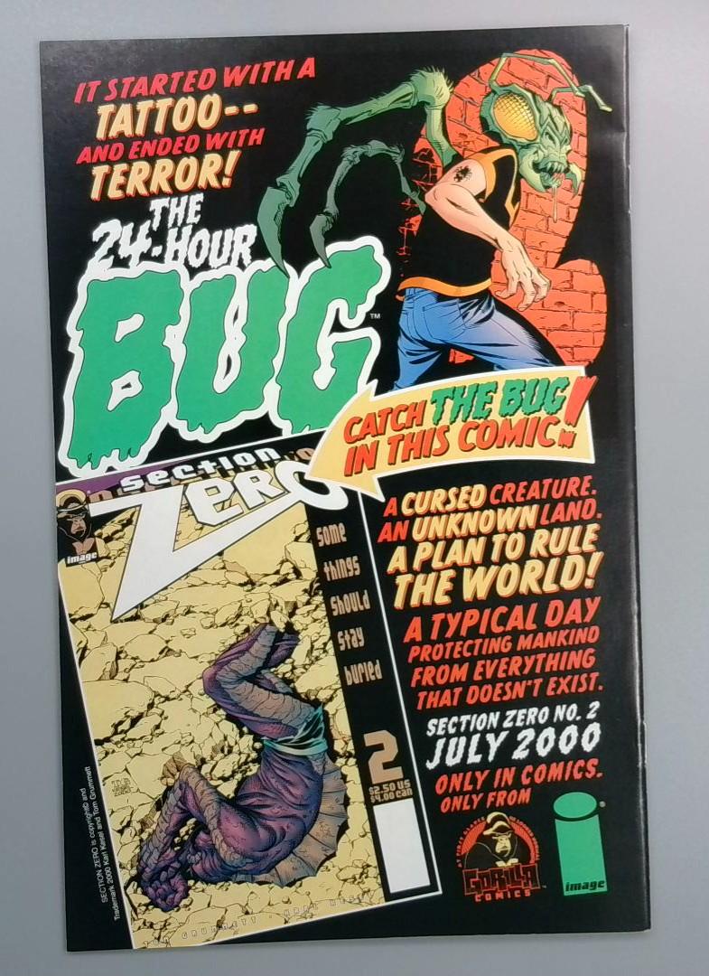 Section Zero #1 (Image/Gorilla Comics, 2000) launches Karl Kesel and Tom Grummett’s paranormal investigation team as they confront unknown lands, cursed creatures, and a plan that could threaten the world. This debut issue sets a sci‑fi/occult adventure tone and even teases the backup feature "The 24‑Hour Bug" on the back cover. Story and art are from creators Karl Kesel and Tom Grummett, with the striking green cover by Tom Grummett.