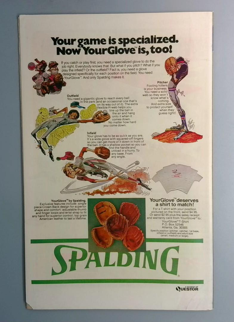 The back cover features a vintage Spalding baseball glove advertisement highlighting specialized equipment for different fielding positions, a nostalgic artifact of 1970s sports marketing that provides additional historical context to the era.