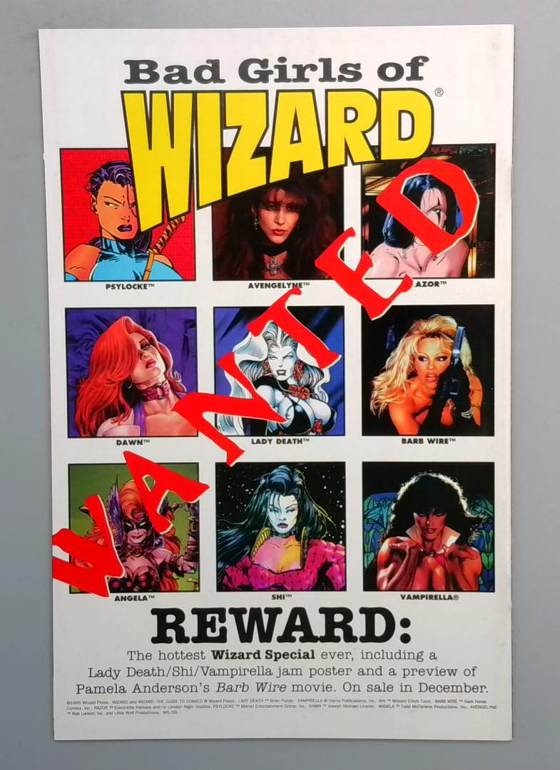 This vibrant poster-style cover features a rogues' gallery of nine iconic "bad girl" characters including Psylocke, Avengelyne, Azor, Dawn, Lady Death, Barb Wire, Angela, Shi, and Vampirella. Released in conjunction with a special Wizard promotion, this issue promised bonus content including a Lady Death/Shi/Vampirella jam poster and a preview of Pamela Anderson's Barb Wire movie adaptation, making it a time capsule of 1990s pop culture crossover appeal.