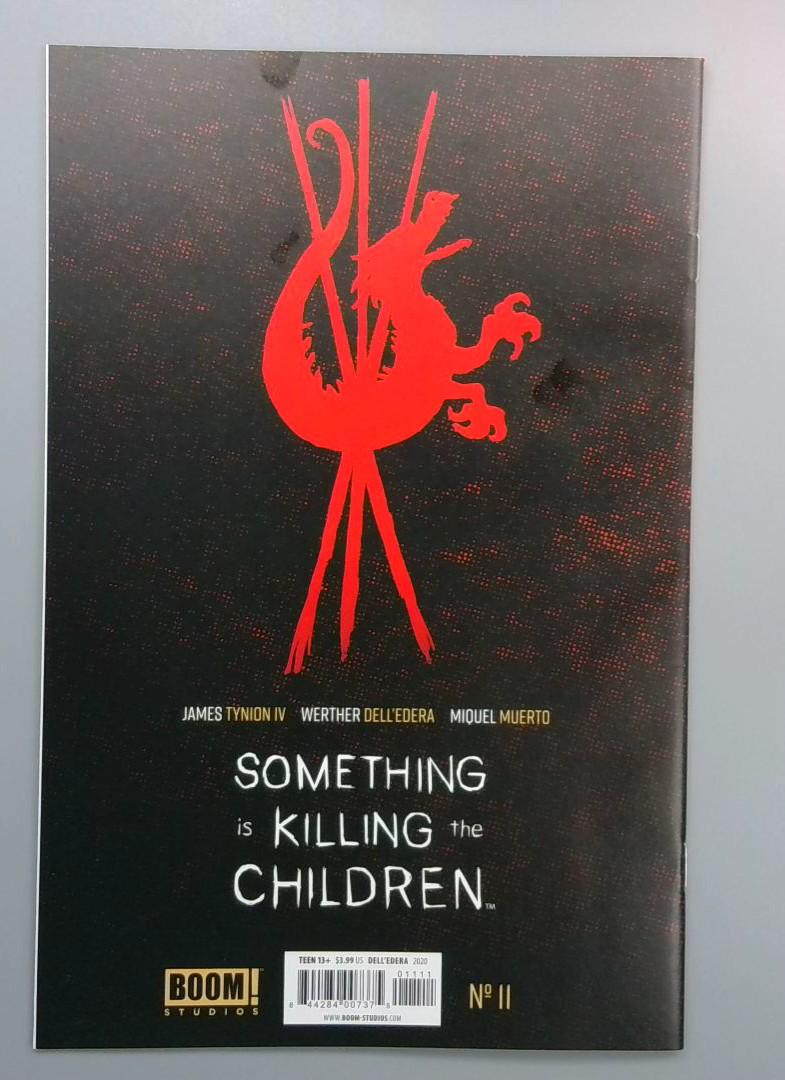 Something is Killing the Children is a horror comic series by James Tynion IV and Werther Dell'Edera, published by BOOM! Studios. The story follows a group of characters facing a mysterious and deadly threat targeting children in a small town. The series blends supernatural horror with a dark, suspenseful narrative, featuring a young protagonist and a mysterious monster hunter. Issue #11 showcases a striking red and black cover highlighting the series' ominous tone.