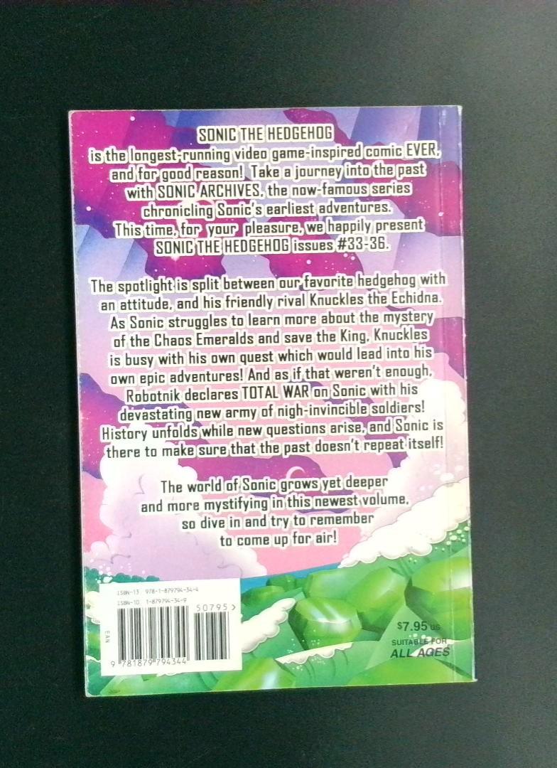 This volume reprints Sonic the Hedgehog issues #33-36, splitting the spotlight between Sonic and his rival Knuckles the Echidna. The storylines follow Sonic as he investigates the mystery of the Chaos Emeralds while protecting the King, while Knuckles pursues his own epic adventures. Meanwhile, Robotnik declares total war on Sonic with a devastating new army of nigh-invincible soldiers, and new questions arise as Sonic works to ensure the past doesn't repeat itself.