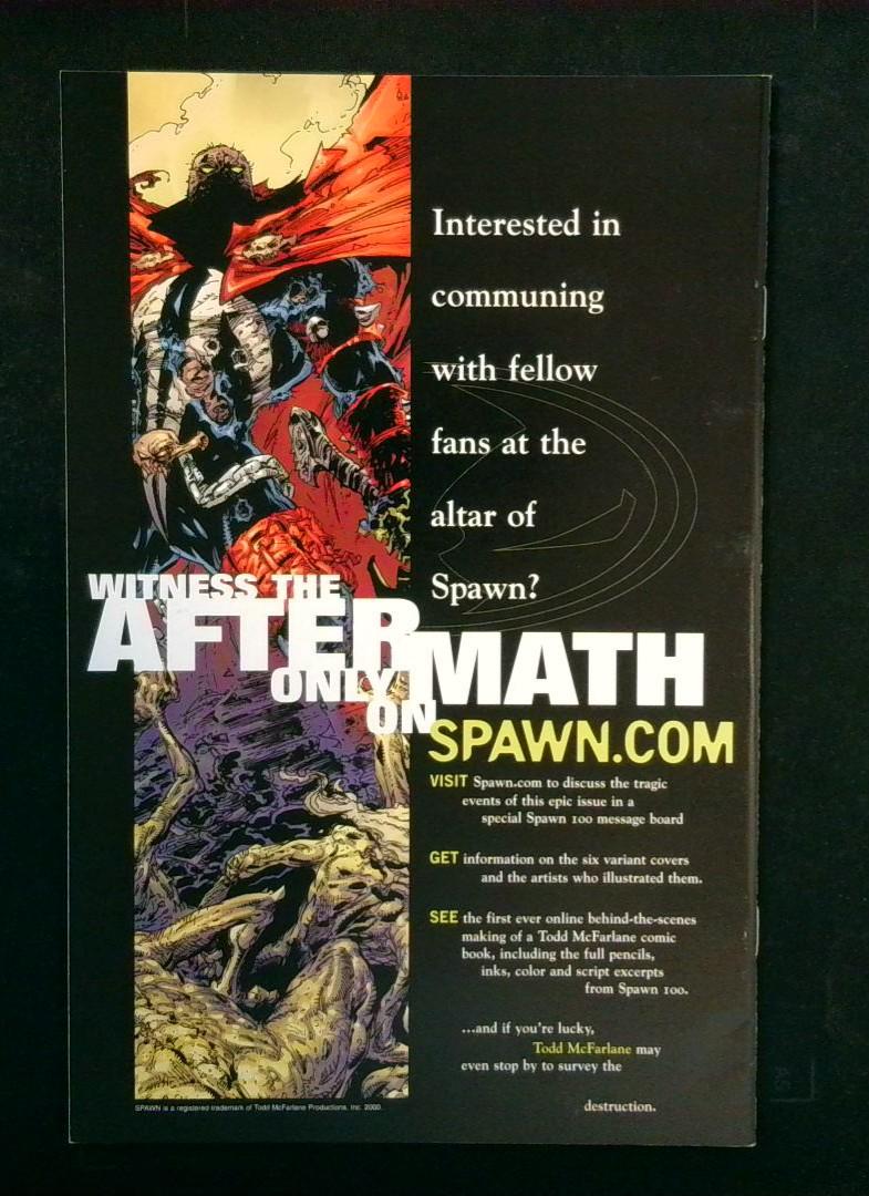 Spawn #100 — the milestone 100th issue — featuring striking cover art by Todd McFarlane. This issue highlights a major turning point in the Spawn saga, promoted as the "Aftermath" of pivotal events and was released as part of a multi-variant cover set. Back cover includes an ad pointing readers to spawn.com for behind-the-scenes content and info on the six variant covers.