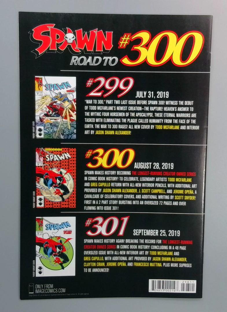 Spawn #298 — Road to #300 variant — features a striking cover by Todd McFarlane depicting Spawn in a violent “Deadly Encounter” and is part of the promotional lead-up to the milestone Spawn #300. The issue ties into the larger "War to 300" storyline and helps set the stage for the celebratory #300 release. McFarlane cover art makes this a standout piece for collectors of the late‑2019 run.