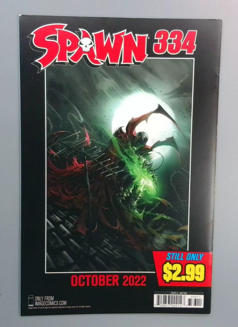 Spawn #334 (October 2022) continues Rory McConville and Carlo Barberi's run as Al Simmons confronts escalating hellish threats and inches toward the "Mark of the Beast" storyline. Story by Rory McConville with art by Carlo Barberi. Striking green-and-black cover art by Mattina spotlights Spawn unleashing necroplasmic energy and chains in a dramatic, high-contrast composition.