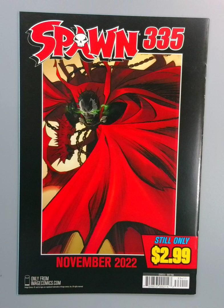 Spawn #334 — Continues Rory McConville and Carlo Barberi’s modern Spawn run as Al Simmons/Spawn faces escalating supernatural threats in Image’s long-running series. Features a striking full-bleed variant cover with the artist credit “MATT” visible on the front and creator credits for Rory McConville and Carlo Barberi. Cover price $2.99.