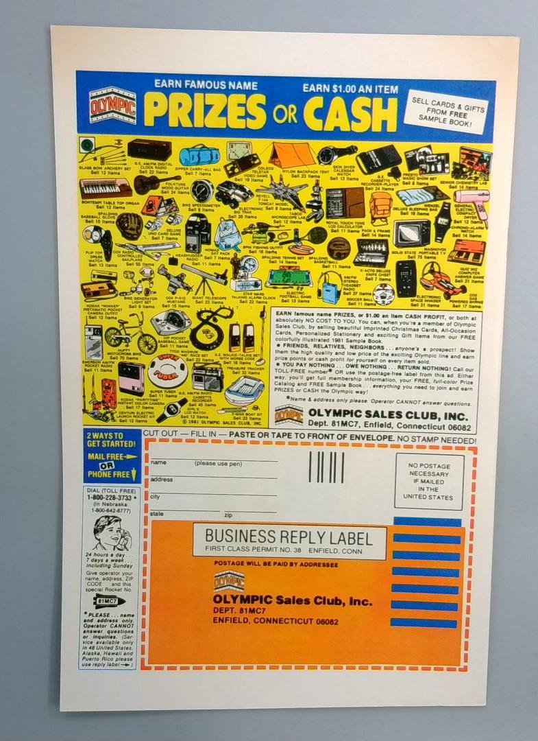 Also included is a vintage Olympic Sales Club promotional insert, a classic mail-away advertisement common to comics of this era, offering prizes and cash incentives for selling greeting cards and gift items.