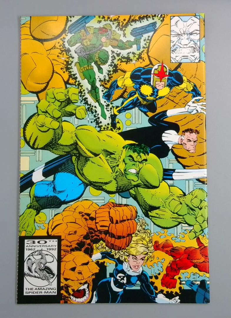 Spider-Man #23 features the thrilling conclusion to "Revenge of the Sinister Six" storyline, showcasing an intense battle with multiple Marvel characters including Ghost Rider, Deathloki, and the Fantastic Four. The cover dramatically depicts Spider-Man surrounded by villainous characters, with a bold, action-packed composition highlighting the high-stakes confrontation. This issue promises an epic finale to a major storyline, with dynamic artwork typical of the early 1990s Marvel style. The accompanying image shows another Marvel comic featuring the Hulk, Nova, and other characters in a vibrant, explosive scene, which appears to be part of a 30th anniversary celebration from 1962-1992.