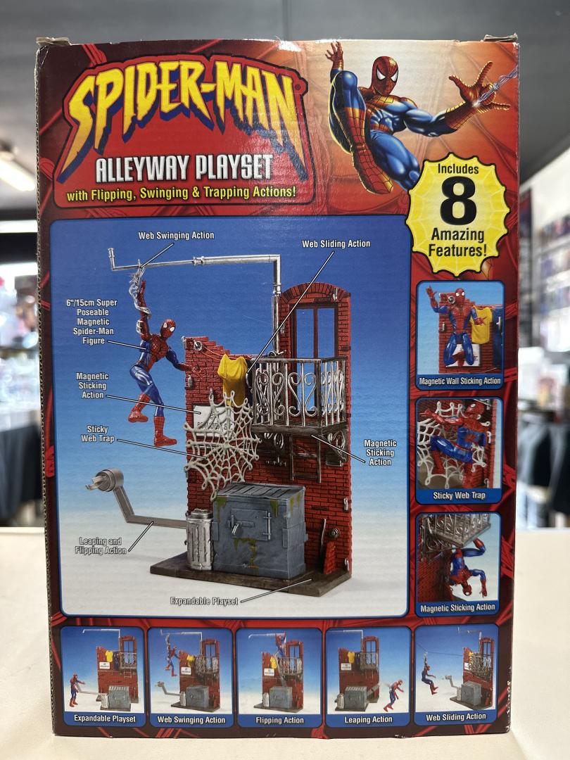 Spider-Man Alleyway Playset featuring a detailed brick building facade with address "54 Mauler St." and magnetic wall feature. The set includes a 6-inch articulated Spider-Man figure in classic red and blue costume with web-shooting action features. Includes eight interactive features: web swinging action, sticky web trap, and magnetic sticking action, plus flipping and trapping mechanics. The playset appears complete and in excellent near-mint condition with original packaging intact, though the contents have not been removed from the box.