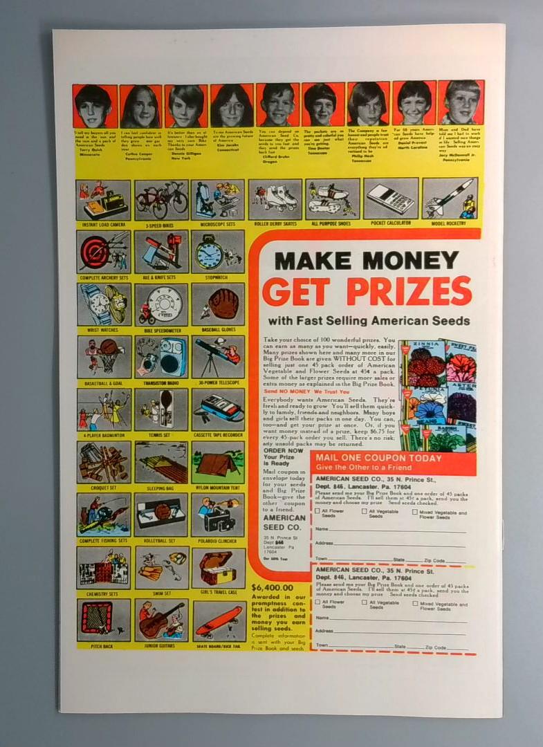 The back cover includes a vintage American Seeds promotional advertisement featuring a collage of children's photos and a prize giveaway promotion, a common insert for comics from this era.